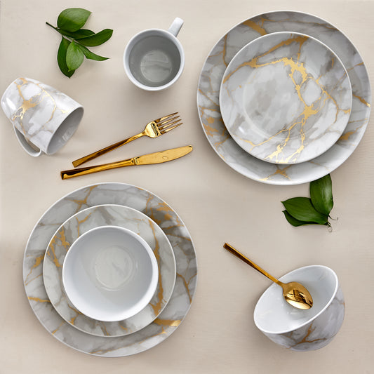 32 Piece Designer Exclusive Combo Set | 16 Piece Dinnerware Set Marble Gold Look & 16 Piece Set Flatware Set Gold, Service for 4, Dishwasher Safe, Plates, Soup or Cereal Bowls, Mugs, Forks, Spoon